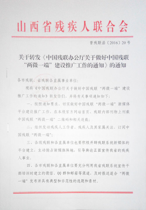 关于转发《中国残联办公厅关于做好中国残联“两微一端”建设推广工作的通知》的通知