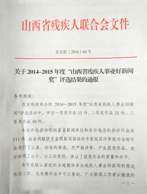 在省残联举办的2014—2015年度“山西省残疾人事业好新闻”评选活动中,评出一等奖作品11件, 二等奖作品21件,三等奖作品30件。