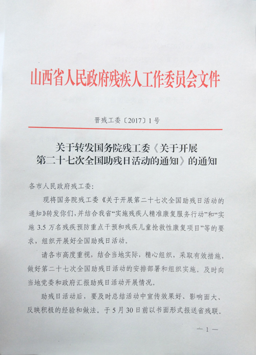 现将国务院残工委《关于开展第二十七次全国助残日活动的通知》转发你们,并结合我省“实施残疾人精准康复服务行动”和“实施3.5万名残疾预防重点干预和残疾儿童抢救性康复项目”等的要求,组织开展好全国助残日活动。