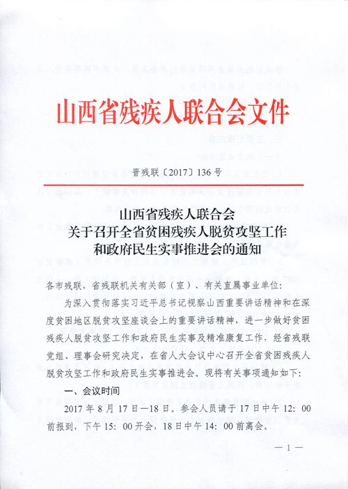 为深入贯彻落实习近平总书记视察山西重要讲话精神和在深度贫困地区脱贫攻坚座谈会上的重要讲话精神,进一步做好贫困残疾人脱贫攻坚工作和政府民生实事及精准康复工作,经省残联党组、理事会研究决定,在省人大会议中心召开全省贫困残疾人脱贫攻坚工作和政府民生实事推进会。现将有关事项通知如下:
