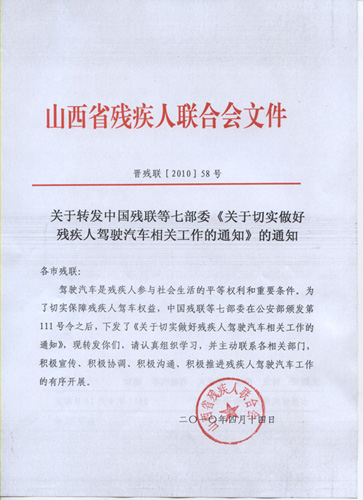 驾驶汽车是残疾人参与社会生活的平等权利和重要条件。为了切实保障残疾人驾车权益,中国残联等七部委在公安部颁发第111号令之后,下发了《关于切实做好残疾人驾驶汽车相关工作的通知》,现转发你们,请认真组织学习,并主动联系各相关部门,积极宣传、积极协调、积极沟通、积极推进残疾人驾驶汽车工作的有序开展。
