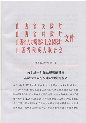 《中共中央、国务院关于促进残疾人事业发展的意见》(中发〔2008〕7号)提出“加强各级残联的建设,健全基层残疾人组织”等相关要求后,民政部、财政部、人力资源和社会保障部、中国残联四部门于近日联合下发《关于进一步加强和规范基层残疾人组织建设的意见》(残联发〔2009〕13号)。为认真贯彻中央7号文件和四部门文件精神,进一步落实《中共山西省委、山西省人民政府关于加快残疾人事业发展的实施意见》(晋发〔2009〕18号),为我省残疾人事业加快发展提供坚实的组织基础和队伍保障,着力推进残疾人社会保障体系和服务体系建设,加速残疾人整体达小康进程,现就进一步加强和规范我省基层残疾人组织建设工作提出如下实施意见。