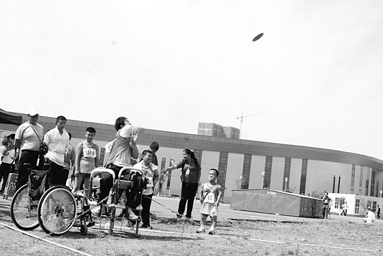 8月26日,在山西体育中心的省十届残运会赛场,运动员正在比赛。截至当日,比赛共产生52枚金牌,其中游泳38枚、盲人柔道2枚、举重4枚、飞镖1枚、田径6枚、乒乓球1枚。 (郭建军 武振宁摄) 转载来源:http://epaper.sxrb.com/shtml/sxrb/20140827/79446.shtml
